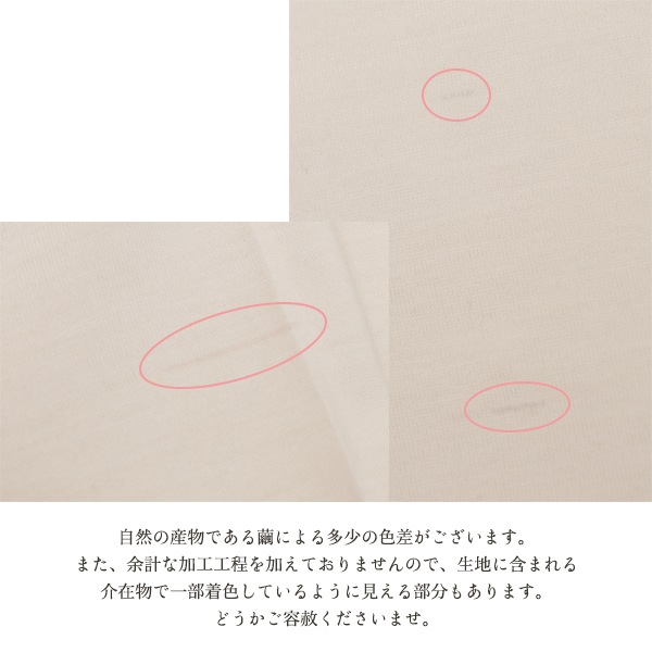・天然繊維のため、10%未満の範囲で縮む場合がございます。また、気候やロット、色等により、サイズ・縮率や色味が多少異なる場合がございます。