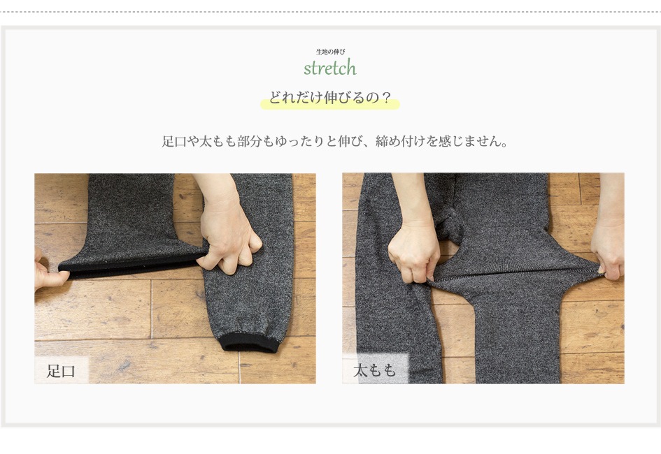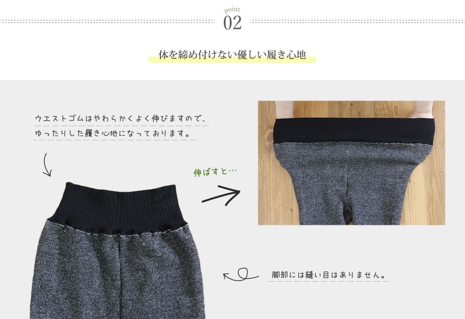 ウエスト部分は腹巻素材になっていますので、ゴムは使用しておりません。
