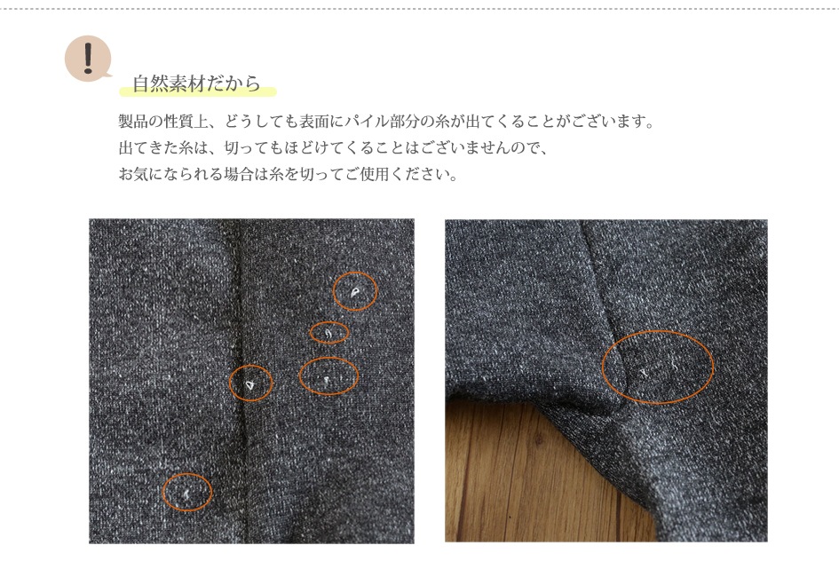 ・天然繊維のため、重ねて着用される衣服の素材等によって、毛羽、毛玉が付く場合がございます。