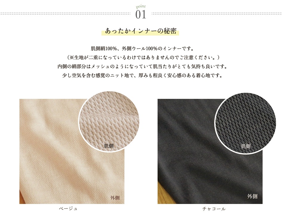 肌側絹100%、外側ウール100%のあったかインナーです。