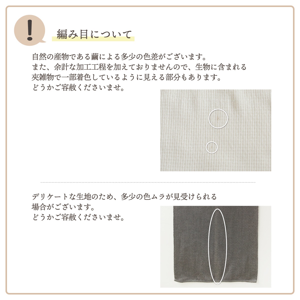・天然繊維のため、10%未満の範囲で縮む場合がございます。また、気候やロット、色等により、サイズ・縮率や色味が多少異なる場合がございます。