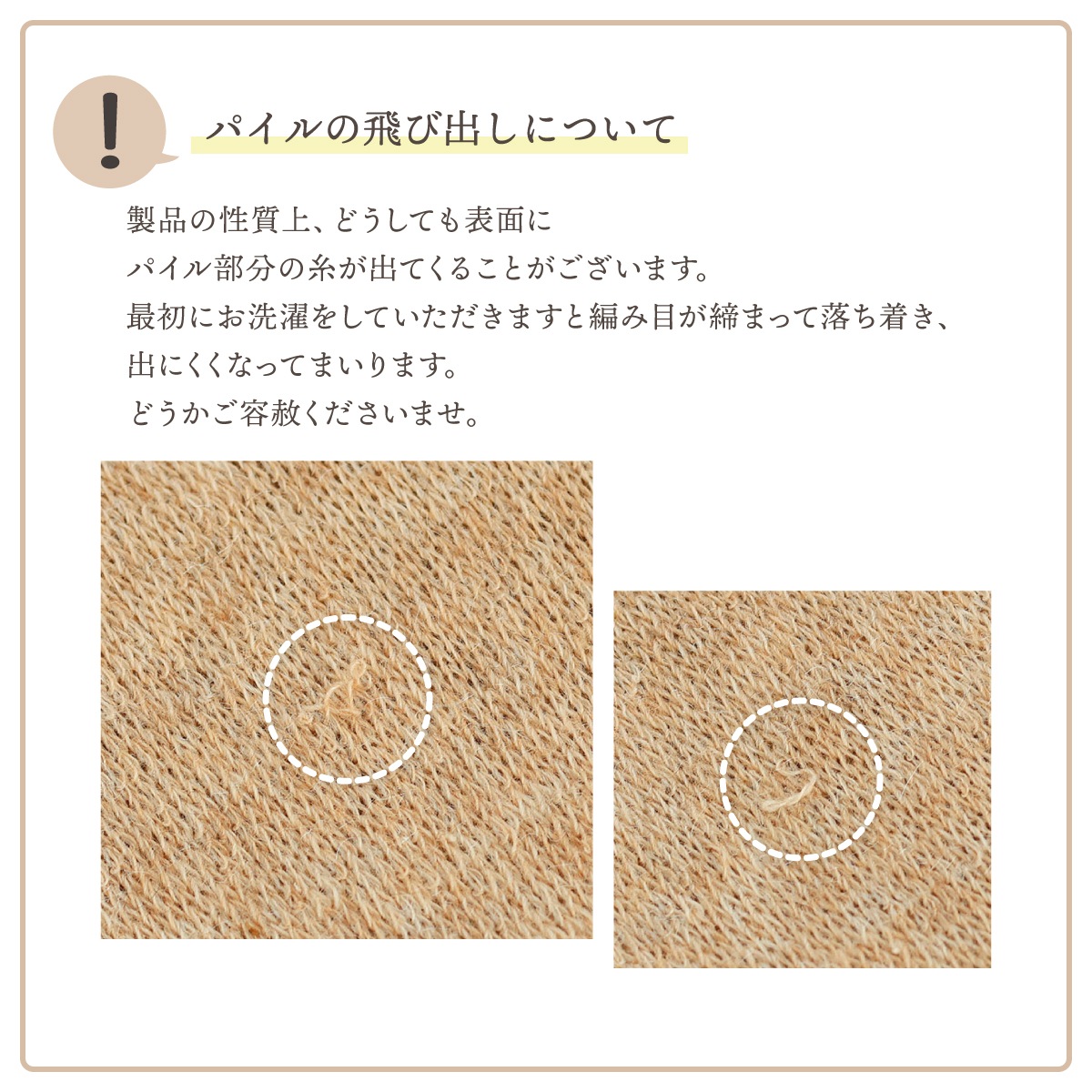 ・製品の性質上、どうしても表面にパイル部分の糸が出てくることがございます。最初にお洗濯をしていただきますと編み目が締まって落ち着き、出にくくなってまいります。