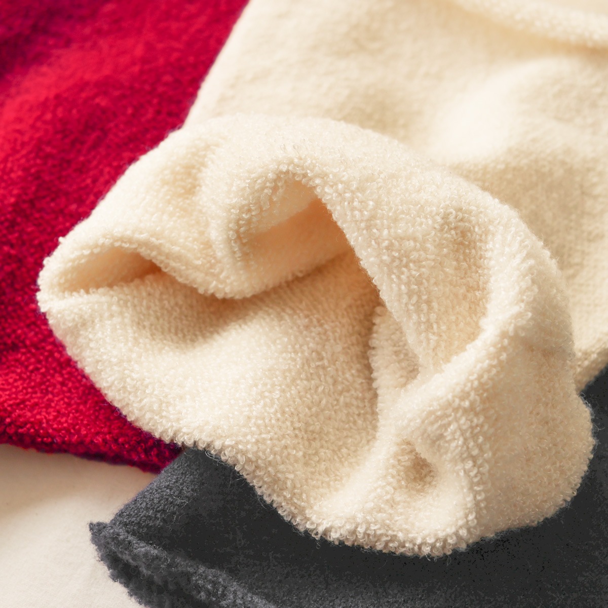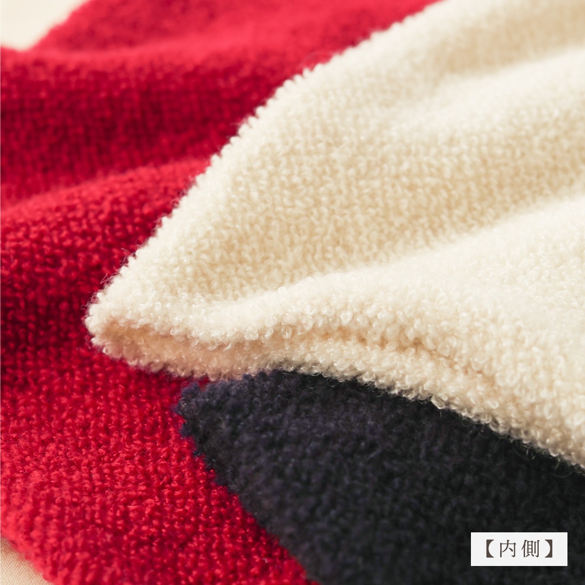 内側のふわふわ優しい風合いのパイルは、カシミヤの温かさとシルクのスベスベ感が活かされています。