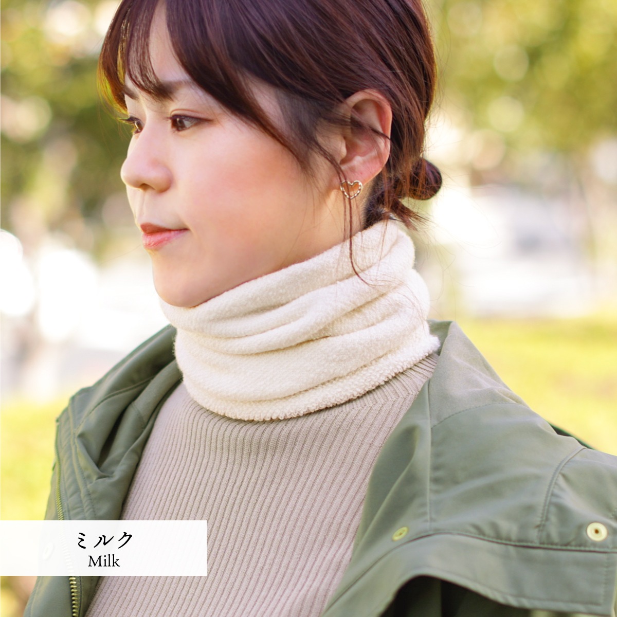 やわらかく包みこむようにあたためてくれる、優しい肌触りのパイルネックウォーマーを作りました。