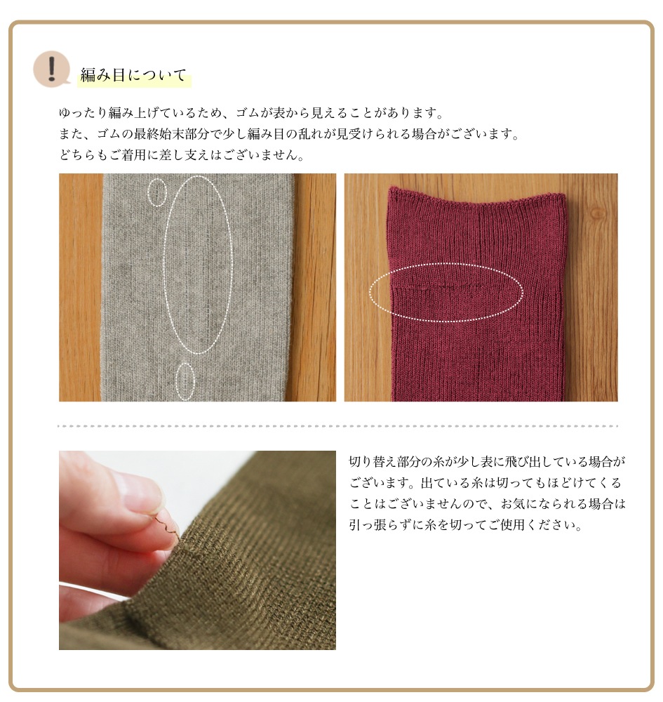 ・天然繊維を多く使って編み上げると、縁や指の始末が難しく、少し糸が出ている事があります。