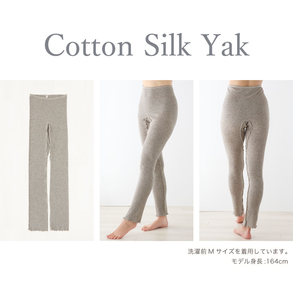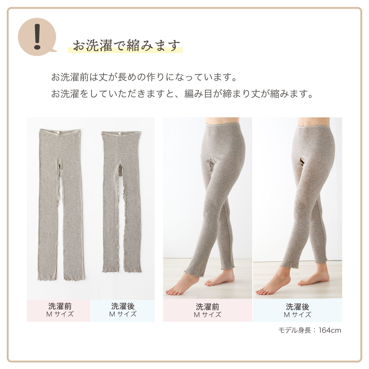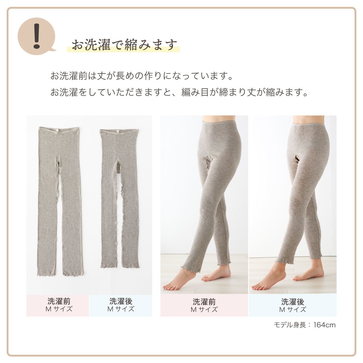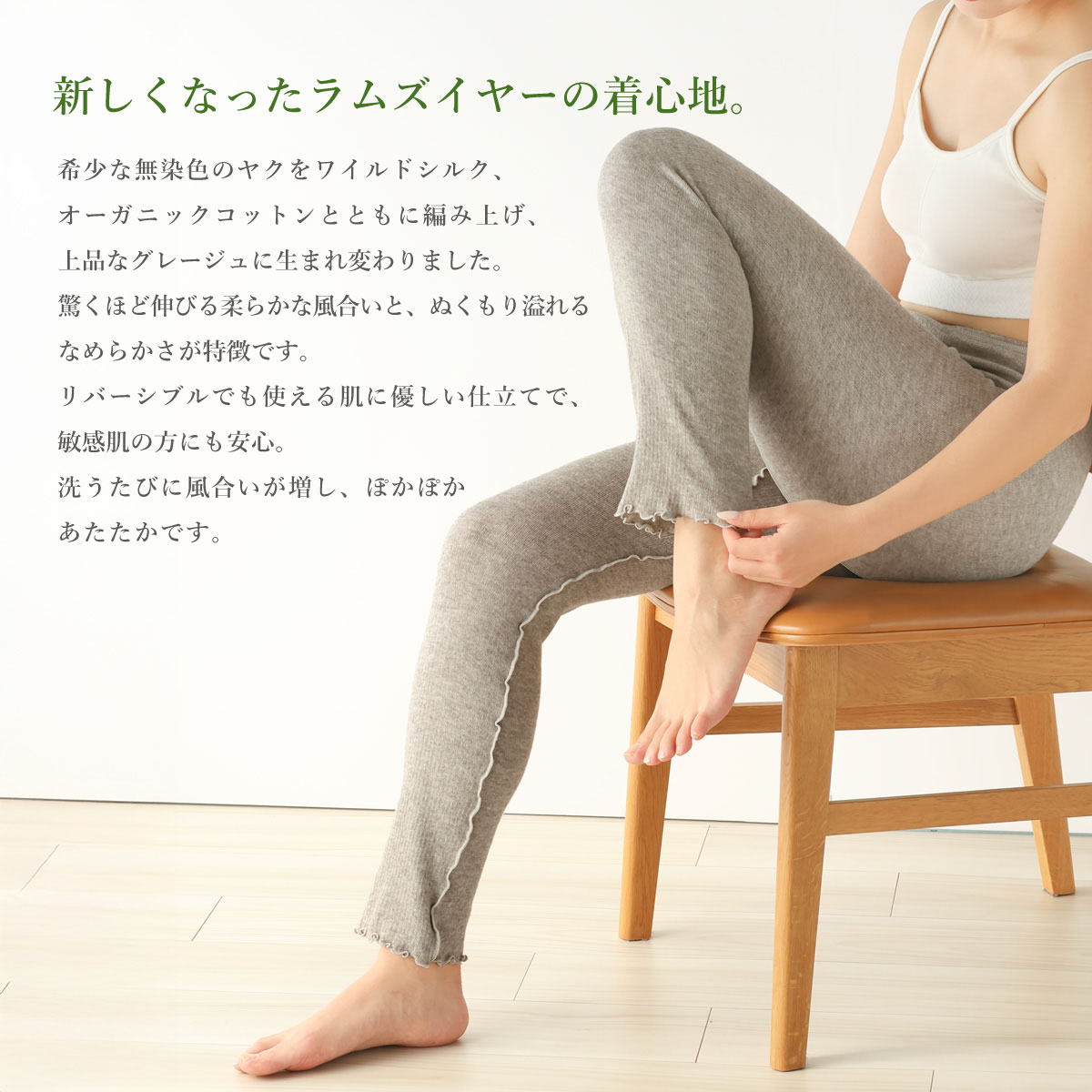 ・裾にゴムを使用せず、編地も天然素材100%で弾性糸を使用しておりませんので、着用中に変形しやすくなっております。お洗濯後、干す際に元の形になるように整えてくださいませ。