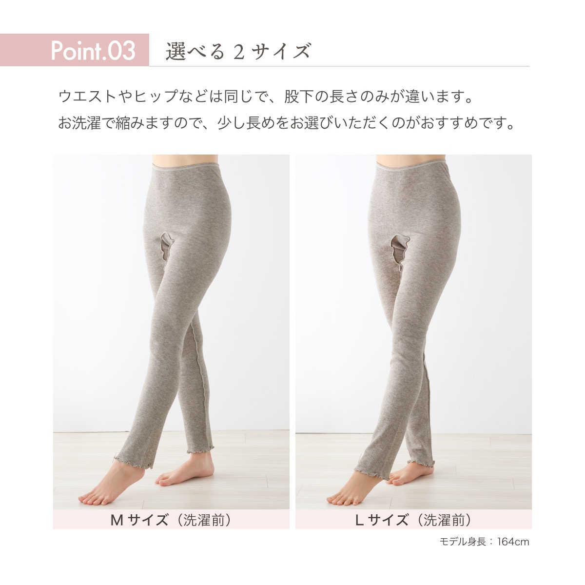 ・筒状の生地をそのまま使っているので、横幅はM・Lともに同じです。股下丈が異なります。