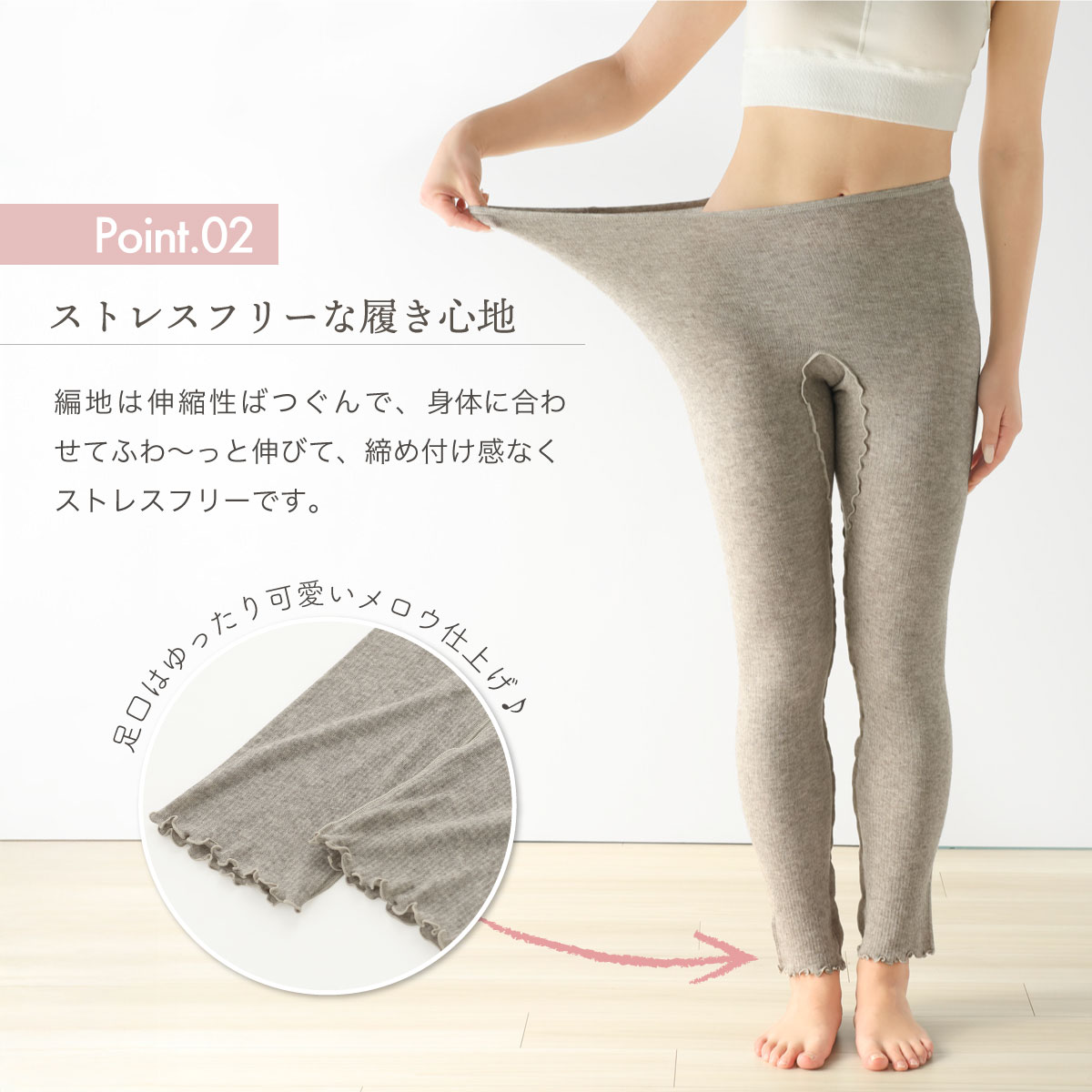 生地がゆったりと伸縮し、優しい着用感と肌触りを感じていただけます。