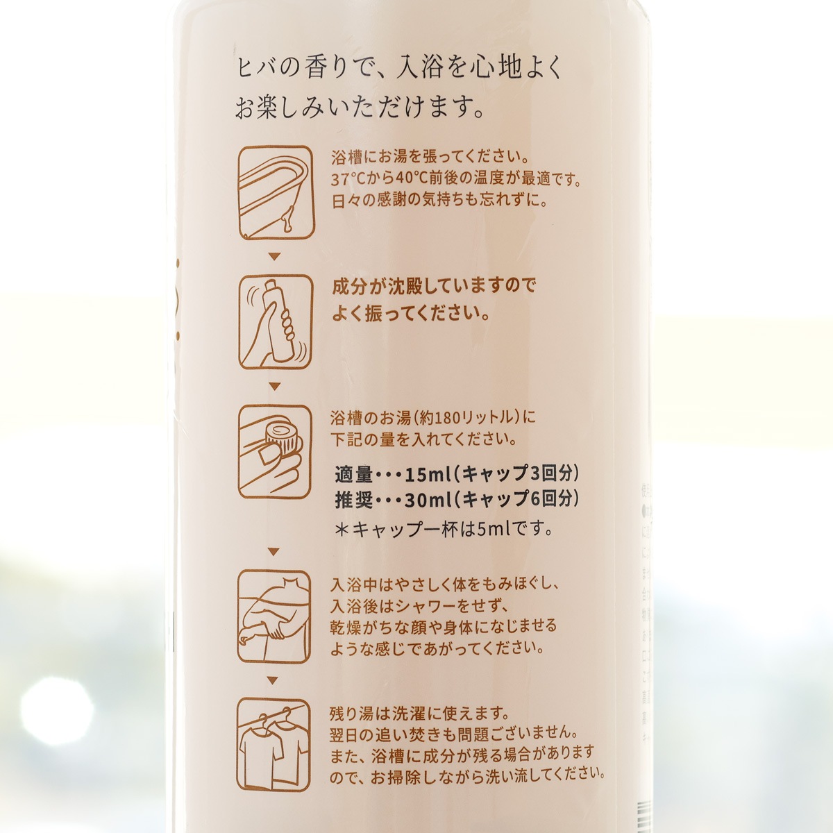 浴槽のお湯(約180リットル)に気分や好みで、適量、推奨を選び、注いでください。