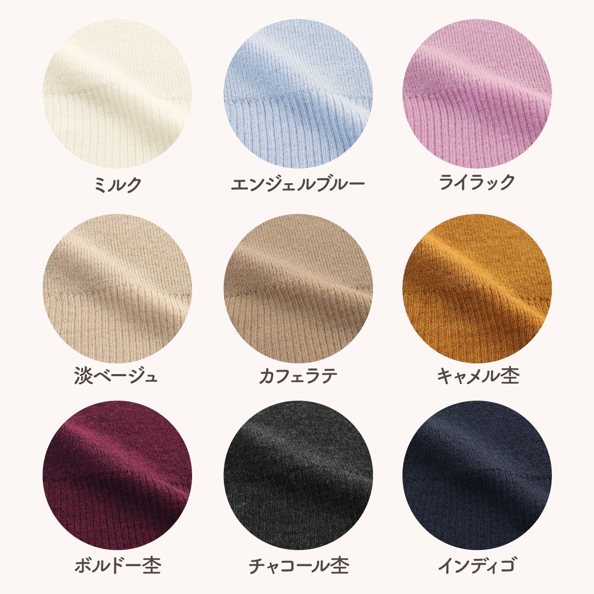 淡ベージュ・エンジェルブルー・ライラック・カフェラテ・インディゴ・チャコール杢・ボルドー杢・キャメル杢・ミルク