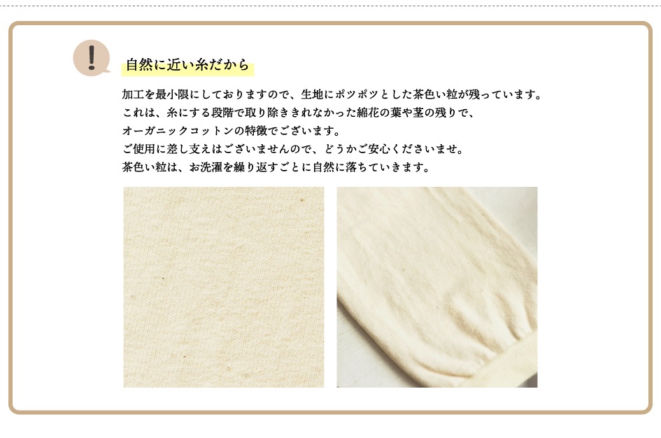 ・生成は染めをしていないので、最終工程の仕上げ蒸し時の綿のアクが少し出ていますが、お洗濯できれいに落ちます。