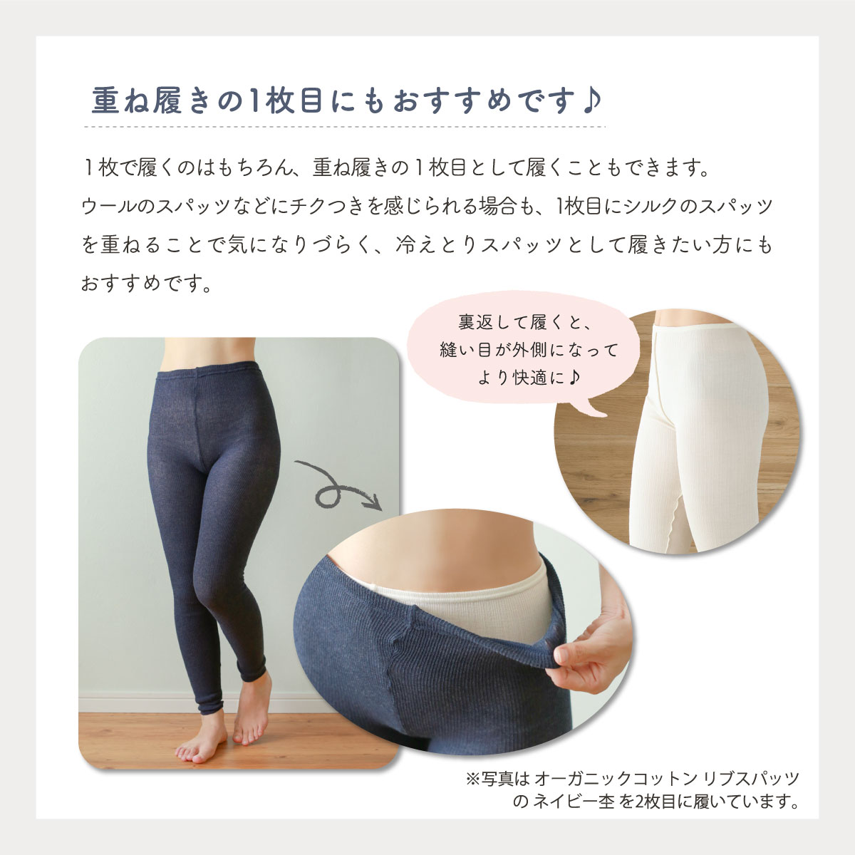 ・生地に裏表がありませんので、縫い目は内側にしても外側にしても着用していただけます。