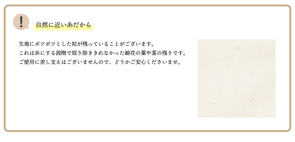 コットンには植物時代のなごりの殻や茎のかけらが少し黒いポツポツなどで残っています。