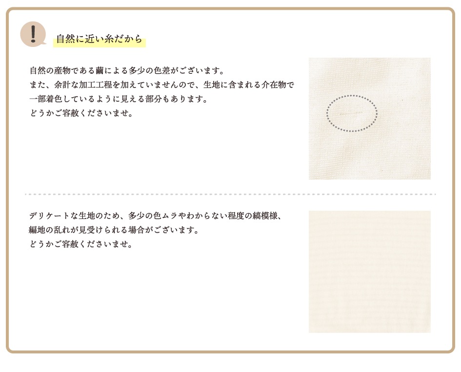 ・天然繊維のため、10%未満の範囲で縮む場合がございます。また、気候やロット、色等により、サイズ・縮率や色味が多少異なる場合がございます。