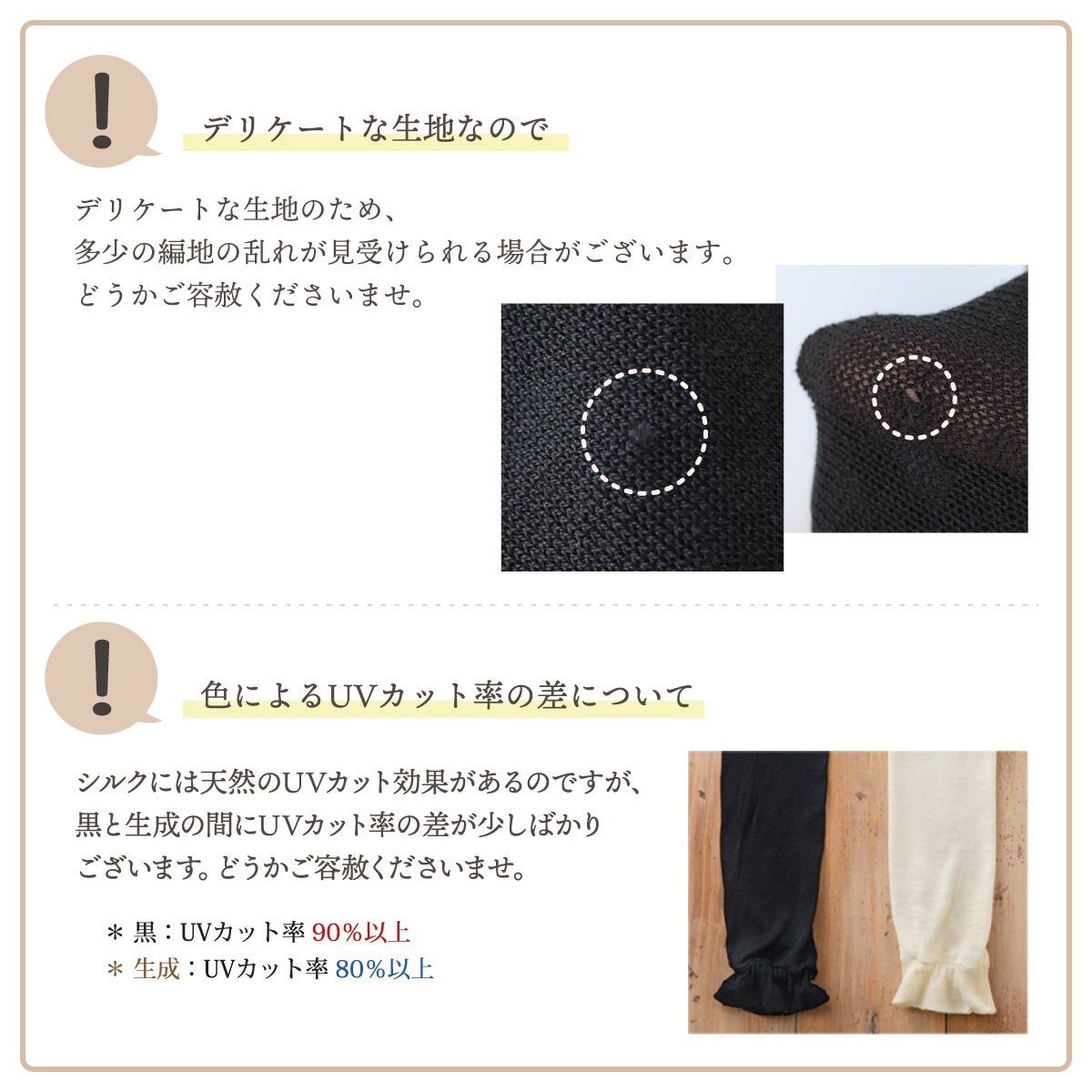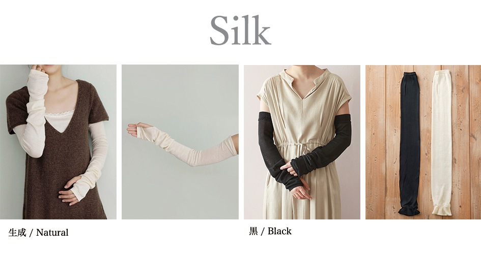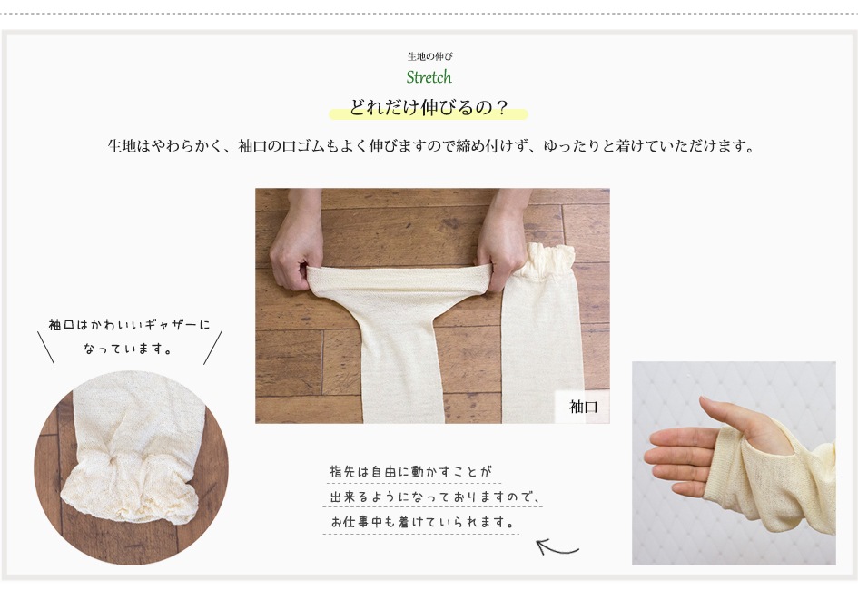 袖口以外は弾性糸を全く使わず、絹(もしくは、ワイルドシルク)100%で編み上げており、