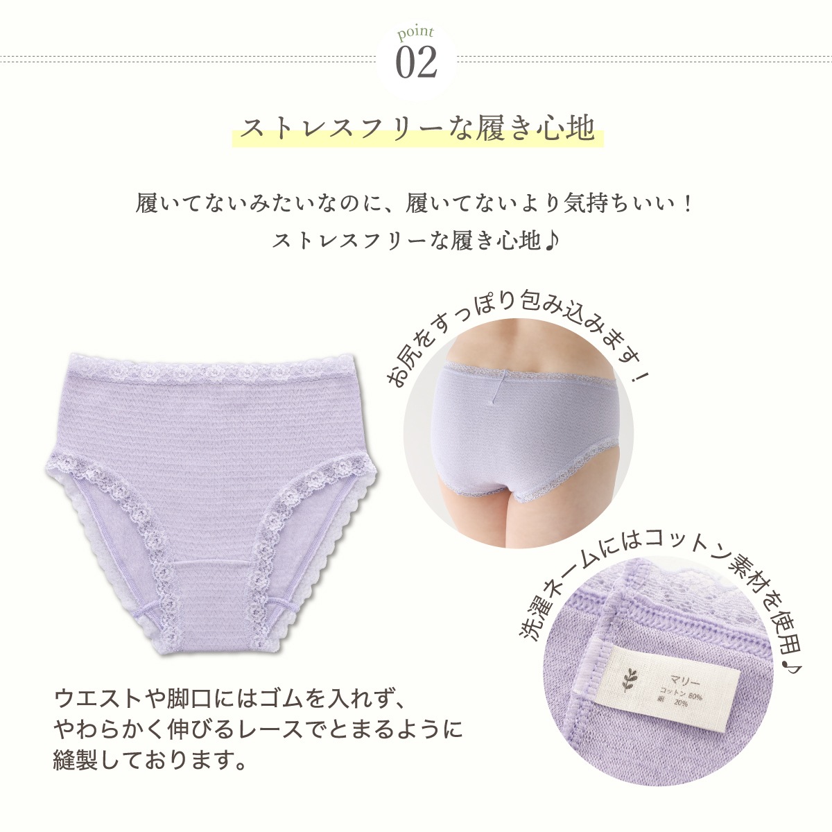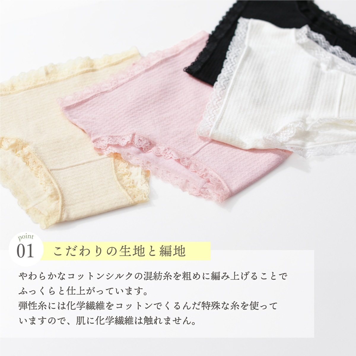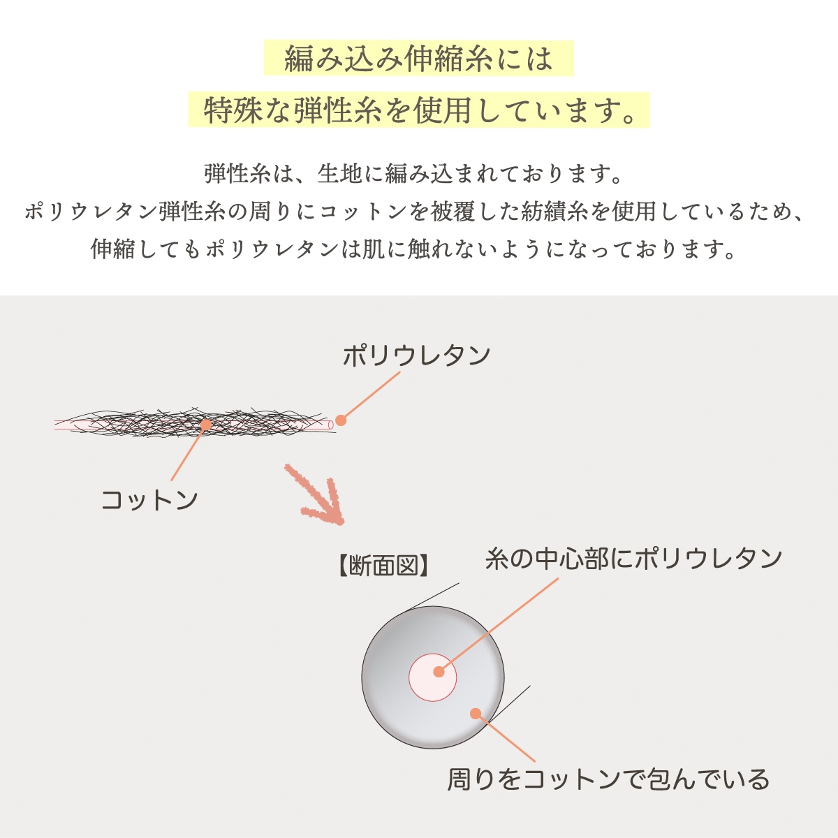 ※編みこみ伸縮糸はコットンに包まれており、肌に触れないよう編み上げています。