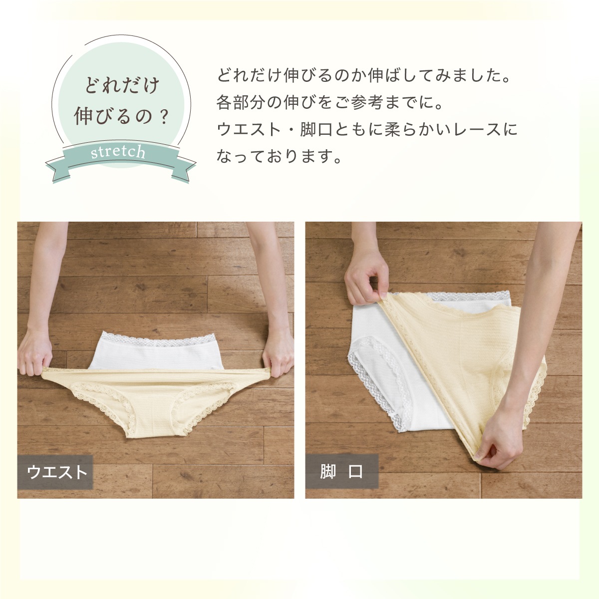 ウエストや足口にはゴム入れず、やわらかく伸びるレースでとまるように縫製しました。