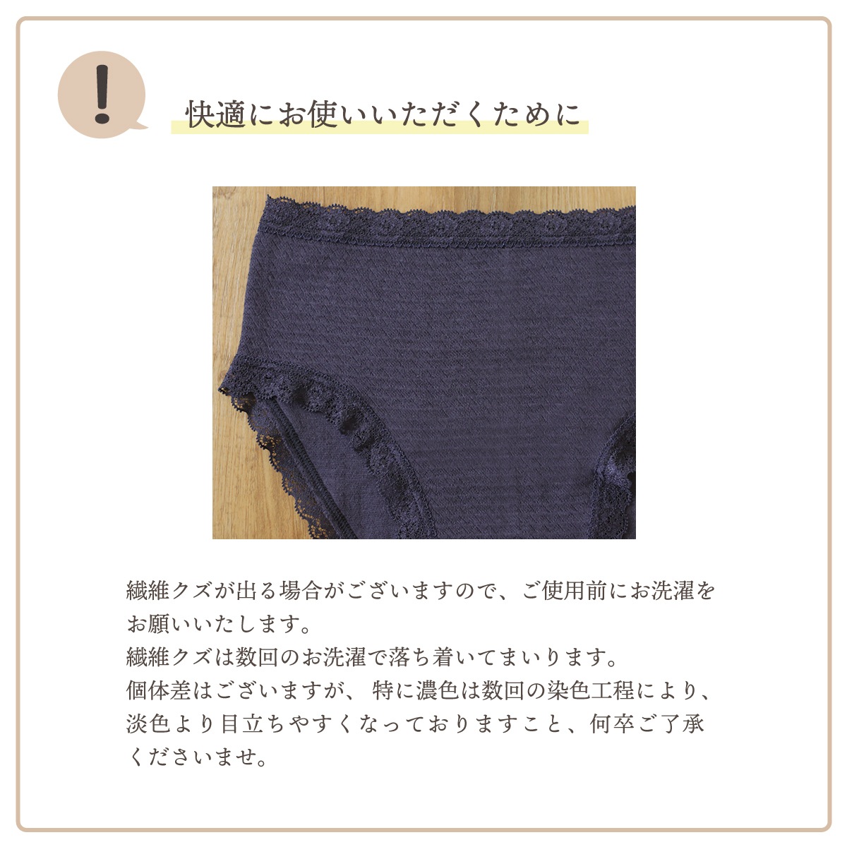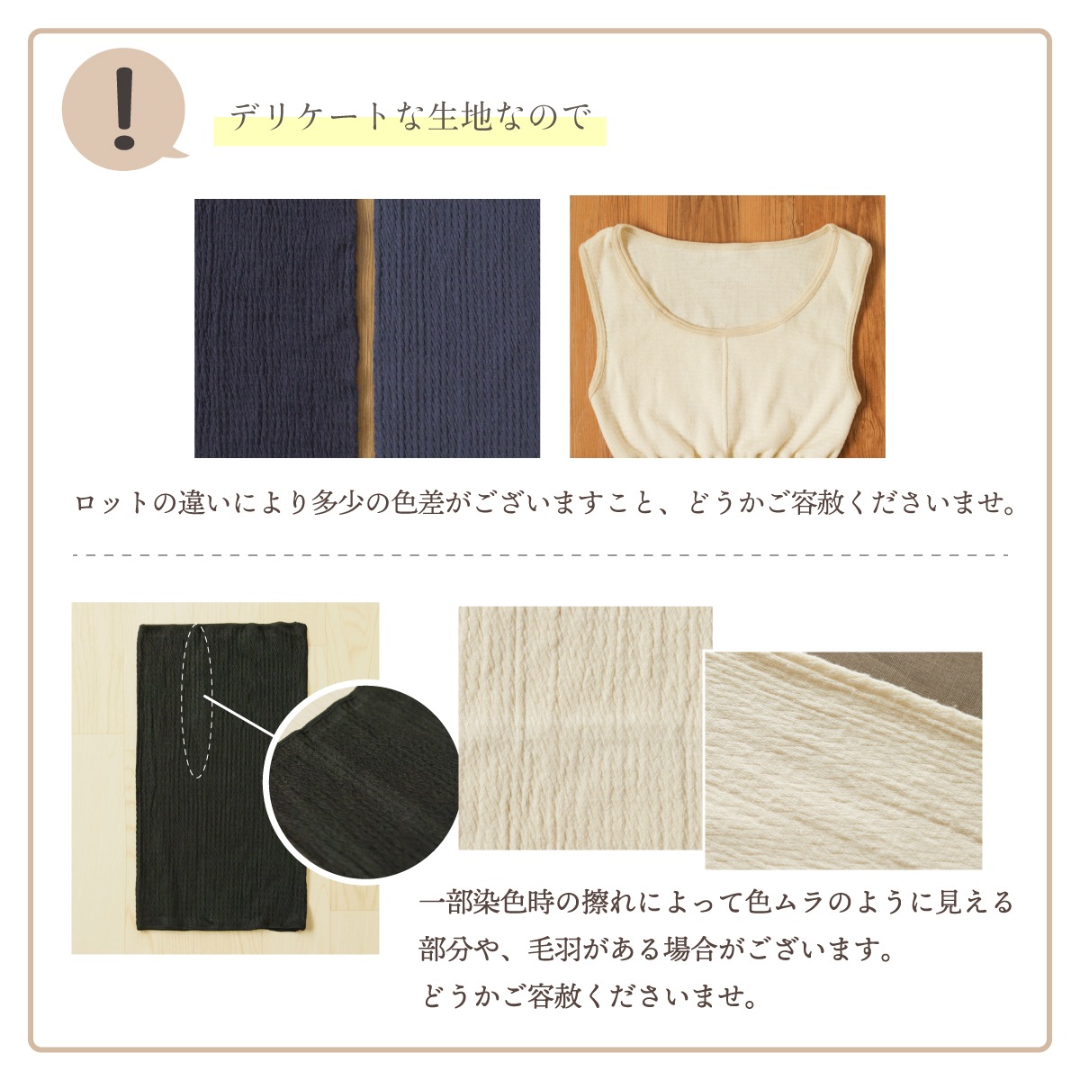 個体差はございますが、特に濃色は数回の染色工程により、淡色より繊維クズが出やすくなっておりますことを何卒ご了承くださいませ。